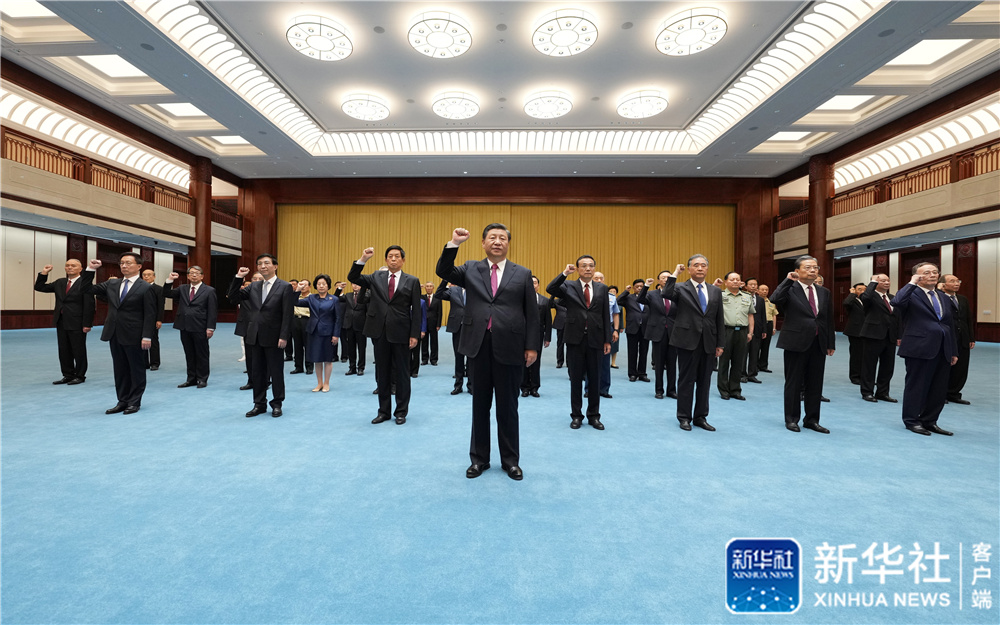 6月18日,黨和國家領(lǐng)導(dǎo)人習(xí)近平、李克強(qiáng)、栗戰(zhàn)書、汪洋、王滬寧、趙樂際、韓正、王岐山等在中國共產(chǎn)黨歷史展覽館參觀“‘不忘初心、牢記使命’中國共產(chǎn)黨歷史展覽”。這是參觀結(jié)束后,習(xí)近平帶領(lǐng)黨員領(lǐng)導(dǎo)同志一起重溫入黨誓詞。新華社記者 鞠鵬 攝