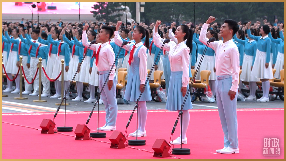 8點(diǎn)整,慶祝大會開始。100響禮炮響徹云霄?,F(xiàn)場升國旗、奏唱國歌。此后,各民主黨派、工商聯(lián)和無黨派人士聯(lián)合致賀詞,由共青團(tuán)員和少先隊(duì)員組成的千人方陣集體致獻(xiàn)詞。