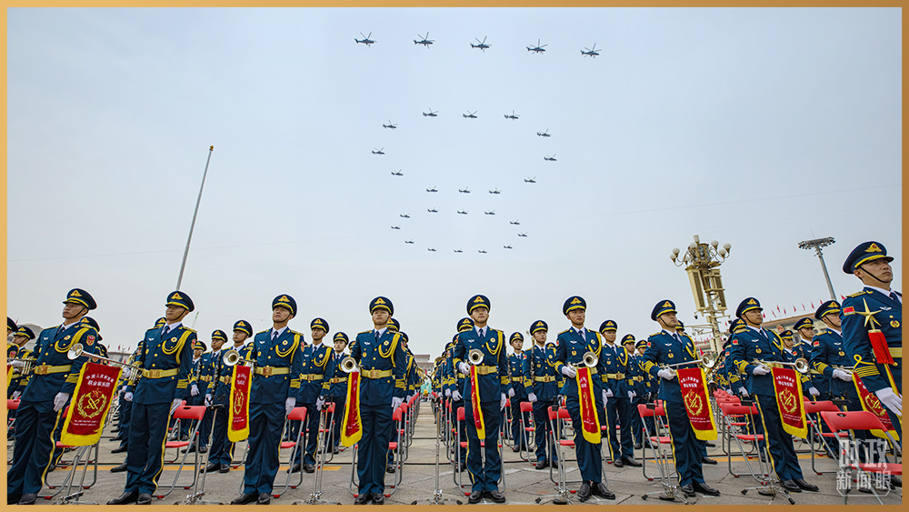 △29架直升機(jī)組成“100”字樣掠過長空。(總臺記者廖江衡拍攝)