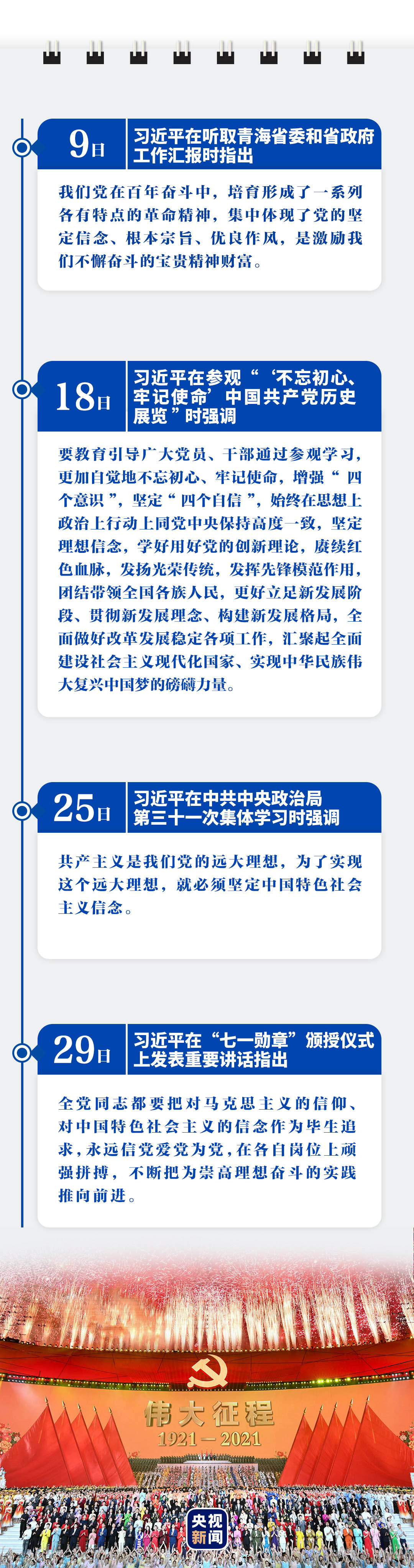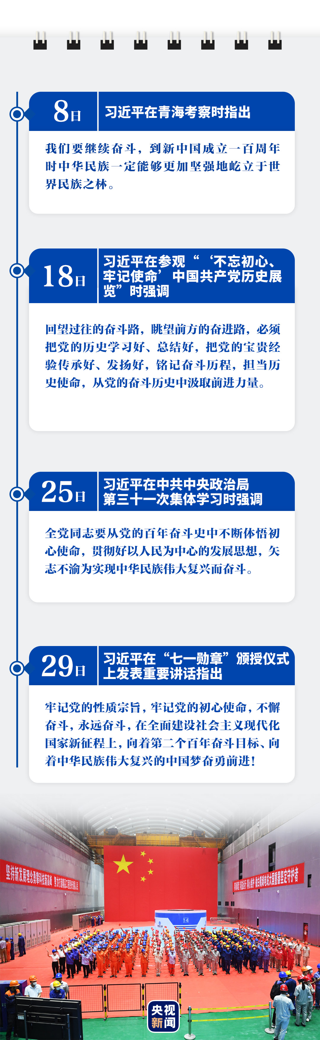 赴中國共產(chǎn)黨歷史展覽館,參觀“‘不忘初心、牢記使命’中國共產(chǎn)黨歷史展覽”,并帶領(lǐng)黨員領(lǐng)導(dǎo)同志重溫入黨誓詞;赴北大紅樓參觀主題展覽、到豐澤園毛澤東同志故居參觀瞻仰,主持中央政治局第三十一次集體學(xué)習(xí);觀看慶祝中國共產(chǎn)黨成立100周年文藝演出《偉大征程》;向“七一勛章”獲得者頒授勛章,并發(fā)表重要講話……習(xí)近平總書記6月的很多重要活動,都與慶祝建黨百年有關(guān)。