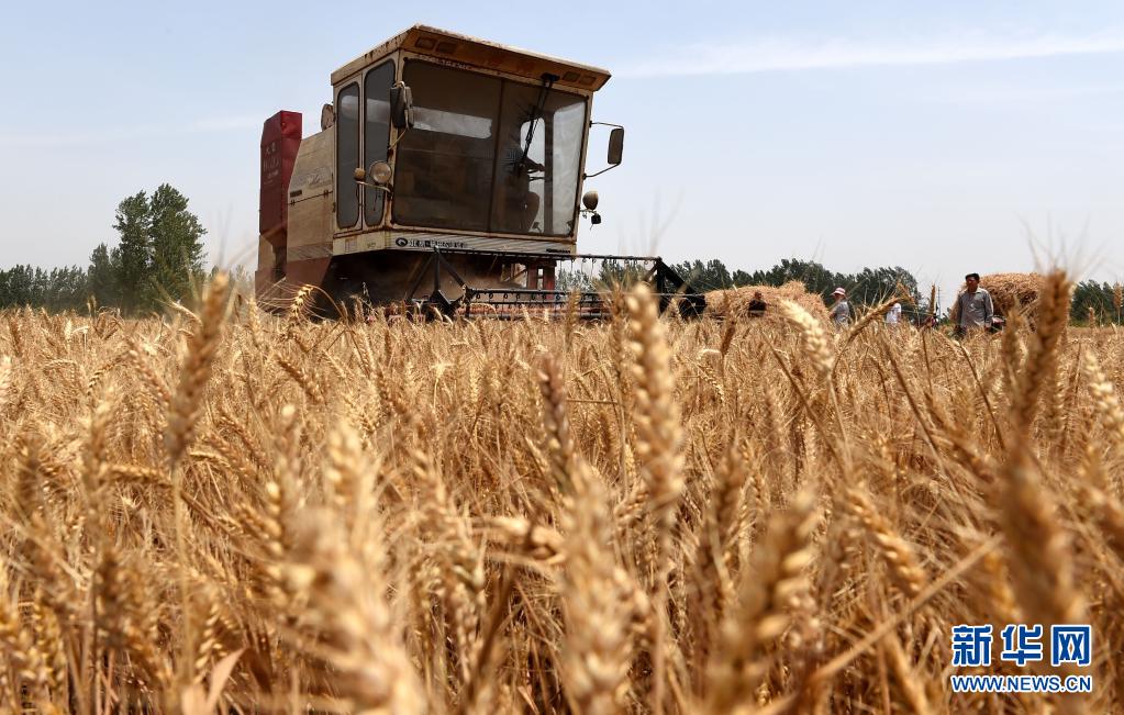 2015年6月6日,一輛聯(lián)合收割機(jī)在河南省開封市尉氏縣張市鎮(zhèn)王崗村的麥田里作業(yè)。新華社記者 李博 攝