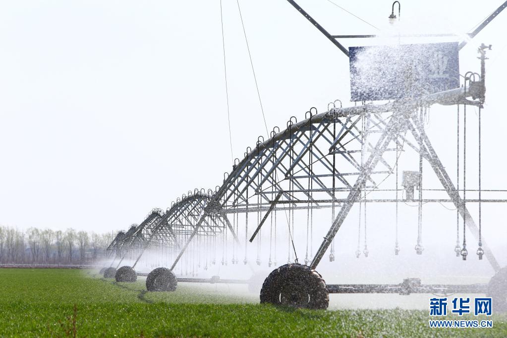 2021年2月23日,在河南省鶴壁市??h一片高標(biāo)準(zhǔn)農(nóng)田里,自走式噴灌機(jī)在為小麥澆水。新華社記者 許雅楠 攝