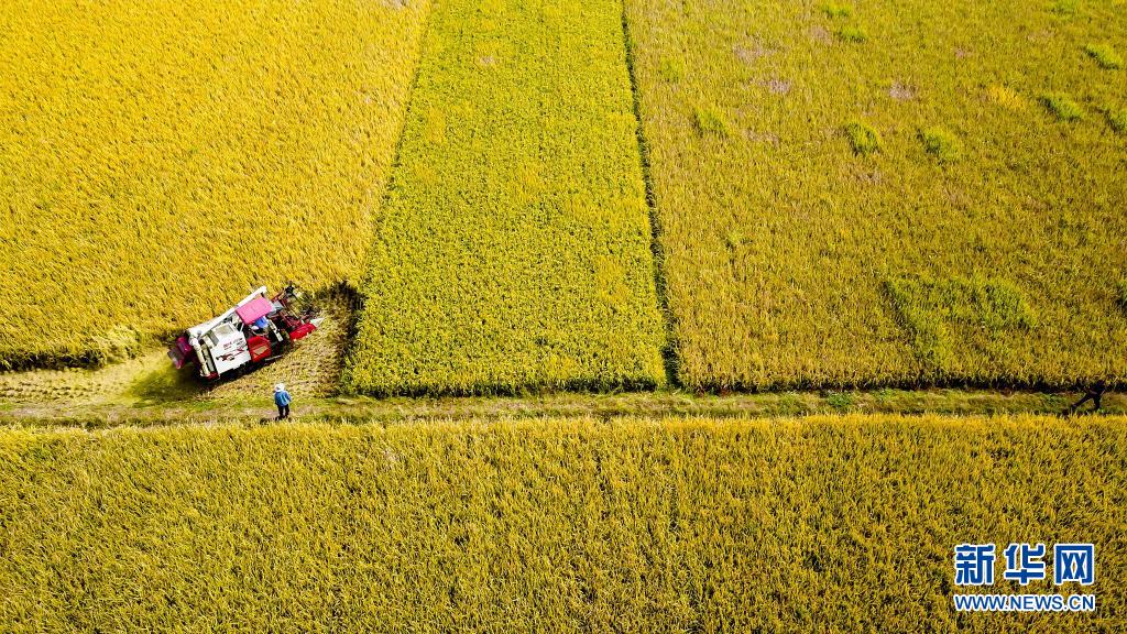 2020年10月21日,在山東省棗莊市臺(tái)兒莊區(qū)邳莊鎮(zhèn),收割機(jī)在收獲水稻(無人機(jī)照片)。新華社記者 郭緒雷 攝