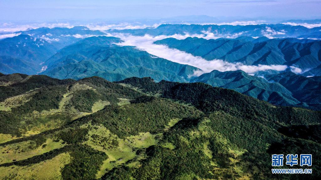 雨后初霽,位于陜西省漢中市留壩縣的紫柏山國(guó)家森林公園內(nèi)云霧升騰,宛如畫(huà)境(2020年9月17日攝,無(wú)人機(jī)照片)。 新華社記者 劉瀟 攝