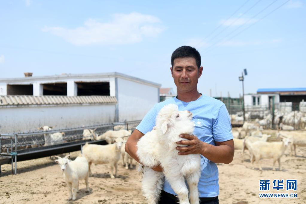 內(nèi)蒙古鄂爾多斯市一名牧民在家中抱起小羊(2021年7月16日攝)。 新華社記者 金良快 攝