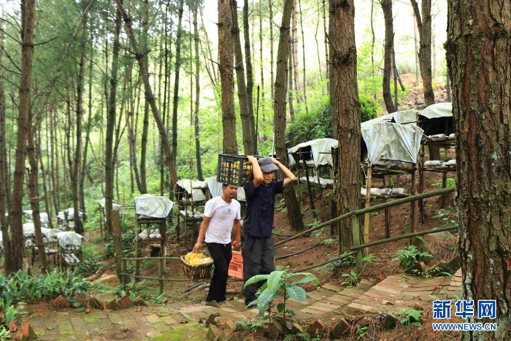 當(dāng)?shù)厝罕娫谫F州省六盤(pán)水市六枝特區(qū)月亮河鄉(xiāng)的花德河國(guó)有林場(chǎng)內(nèi)收獲菌類(2021年7月24日攝)。 新華社發(fā)(令狐榮駿 攝)