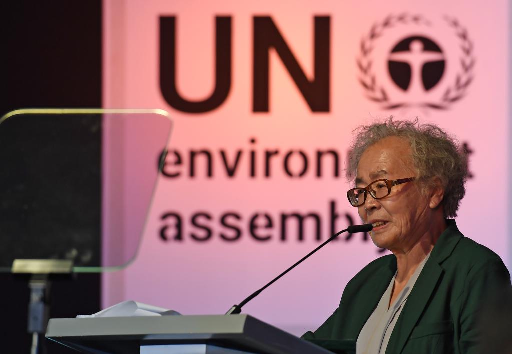 2017年12月5日,在肯尼亞內(nèi)羅畢聯(lián)合國環(huán)境規(guī)劃署總部,塞罕壩第一代務(wù)林人代表陳彥嫻在頒獎晚會上發(fā)表獲獎感言。新華社記者 陳誠 攝
