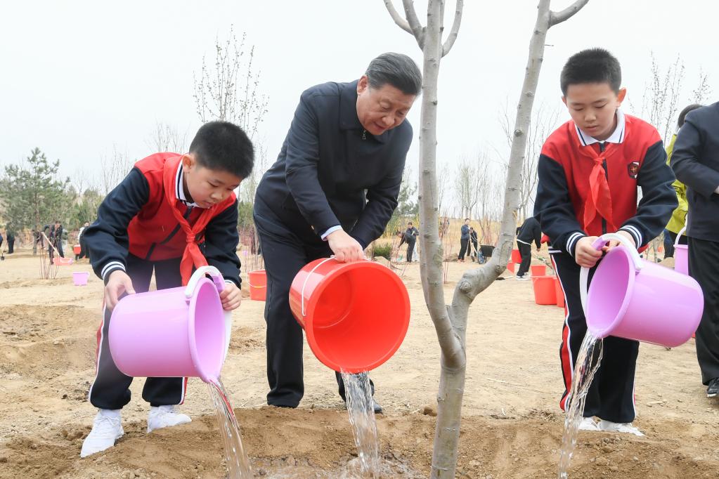 2021年4月2日,習近平總書記來到北京市朝陽區(qū)溫榆河參加首都義務(wù)植樹活動。這是習近平總書記同少先隊員一起給剛栽下的樹苗澆水。新華社記者 李學仁 攝
