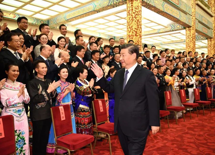 ▲ 8月31日晚,第六屆全國少數(shù)民族文藝會演開幕式文藝晚會在北京人民大會堂隆重舉行。習(xí)近平、李克強、汪洋、王滬寧等黨和國家領(lǐng)導(dǎo)人出席觀看。這是演出開始前,習(xí)近平等會見文藝會演演職人員代表、組委會成員、56個民族的優(yōu)秀基層黨員代表等 燕雁攝/本刊