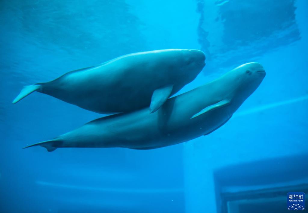 2021年7月5日,在位于武漢的中國科學院水生生物研究所,長江江豚媽媽和小江豚在水中游動。新華社記者 肖藝九 攝