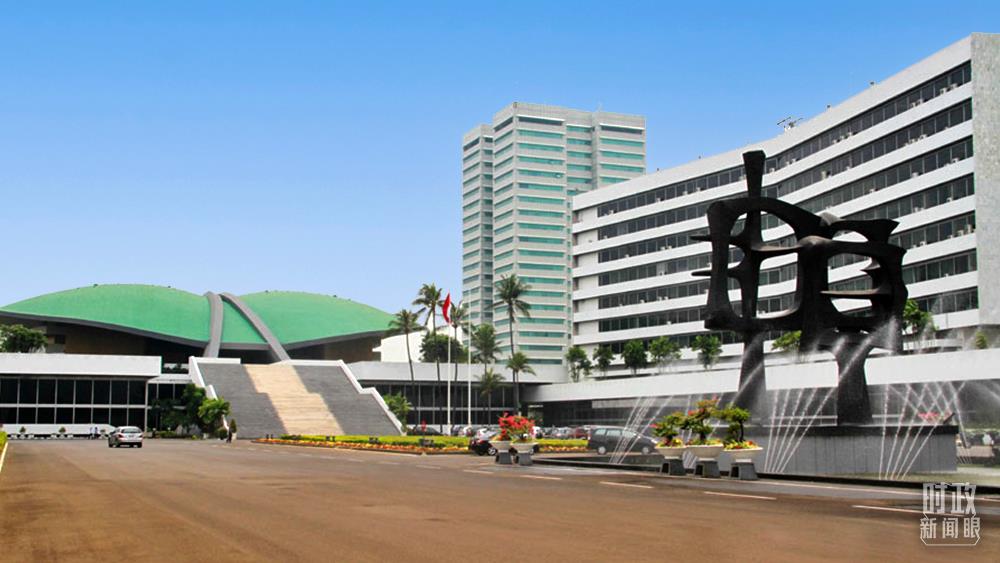 △印度尼西亞國會外景。2013年10月,習(xí)主席在這里發(fā)表演講首次提出建設(shè)21世紀(jì)“海上絲綢之路”。(總臺國廣記者蔡靖骉拍攝)