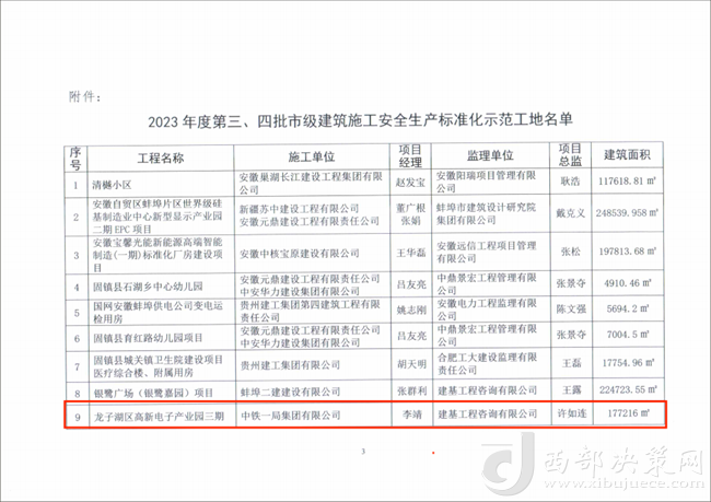 近日,安徽省蚌埠市建筑管理處下發(fā)2023年度第三、四批市級(jí)建筑施工安全生產(chǎn)標(biāo)準(zhǔn)化示范工地名單,公司龍子湖區(qū)高新電子產(chǎn)業(yè)園三期EPC項(xiàng)目欣然在列。