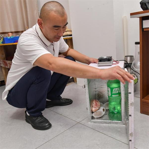 只有初中文憑的楊波就開始學習冰箱知識,了解冰箱原理結構:為什么會制冷還能調節(jié)溫度?等等,做到了了然于胸,又購買了冷卻片、制冷片、散熱片、風扇、溫度計、封條等必備用料,自己又在工地找到了廢棄的塑膠板,在家具店里找來隔熱錫紙,經過一番折騰,一臺高60 厘米、寬40厘米、厚40厘米的手工小冰箱做成功了。使用2個月來,最低溫度可達2攝氏度。效果非常好!
