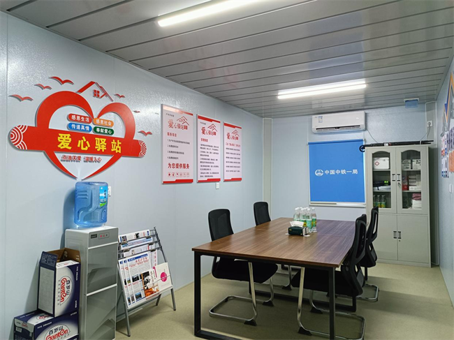 服務(wù)站門口即是S312省道,距離轉(zhuǎn)體梁主要施工工點(diǎn)不足500米,步行8到10分鐘可達(dá)。服務(wù)對(duì)象包括勞動(dòng)工人、環(huán)衛(wèi)綠化工人、市政維修工人等戶外勞動(dòng)者。站點(diǎn)內(nèi)溫暖明亮,空調(diào)和飲水機(jī)的冷熱水24小時(shí)提供便利,雨傘架、充電站解決燃眉之急。急救藥箱內(nèi)含有退燒貼和暖貼,感冒消炎、消毒止血常備藥以供不時(shí)之需,除此之外還增設(shè)特色閱讀區(qū),各類書(shū)籍、月刊、報(bào)紙可供勞動(dòng)者休息時(shí)閱讀放松,并由工作人員定期更新。