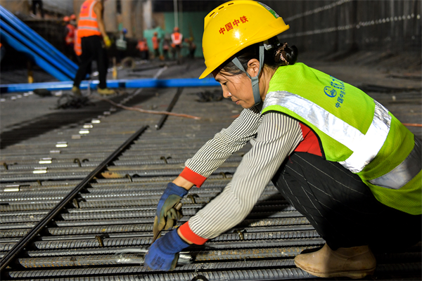 在1號工點的第3層基坑里,東邊,10幾名穿著印有工種名稱的反光馬甲的工人正忙著安裝模板鋼支撐;西邊,20幾名同樣穿著馬甲的工人,或綁扎鋼筋,或轉運鋼筋,或焊接鋼筋……一派忙而有序的大干場面。在3號工點地面,華燈初上,1臺吊車,4、5名鋼筋工、電焊工也在忙個不停……