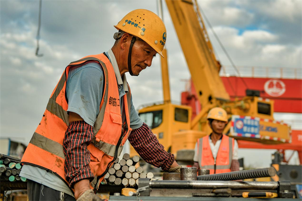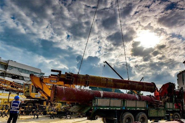 照此安排,項目部各部門、作業(yè)隊既各自為戰(zhàn),又協(xié)調(diào)統(tǒng)一,按區(qū)域、分專業(yè)、依先后齊頭并進。筆者在地面施工區(qū)域看到,盾構(gòu)井臨時封堵板的鋼筋綁扎已經(jīng)完成,8名作業(yè)人員和監(jiān)理、技術(shù)人員在做最后的檢查,混凝土罐車、泵車嚴(yán)陣以待……不一會兒,混凝土順著管子就流向了鋼筋網(wǎng)內(nèi),4名振搗工也隨之開始忙碌,嗡嗡聲響成一片。車站1號鋼筋場,10幾名穿著印有“鋼筋工”“信號司索工”馬甲的工人,或協(xié)助吊車調(diào)運鋼筋、或切割鋼筋原材下料;不遠(yuǎn)處,吊車調(diào)運明挖段鋼支撐轉(zhuǎn)場……