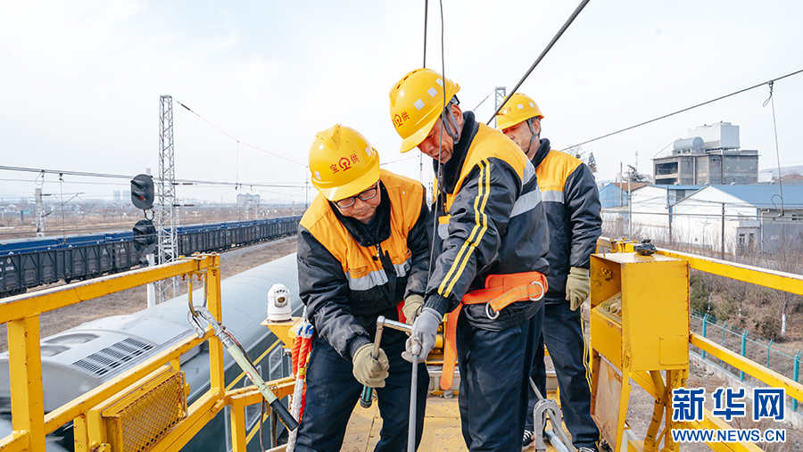 在隴海鐵路虢鎮(zhèn)至陽(yáng)平區(qū)段,劉建強(qiáng)(左)和工友們?cè)诠╇娊佑|網(wǎng)軌道作業(yè)車(chē)上緊固供電設(shè)備接觸網(wǎng)腕臂支撐。劉一江 攝