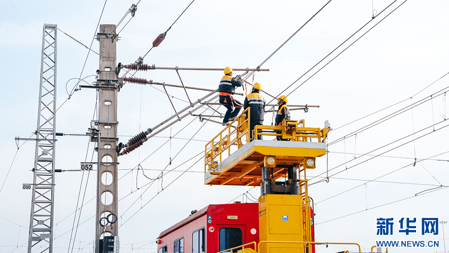 在隴海鐵路虢鎮(zhèn)至陽(yáng)平區(qū)段,劉建強(qiáng)和他的工友在供電接觸網(wǎng)軌道作業(yè)車(chē)上緊固接觸網(wǎng)吊弦。趙 濤 攝