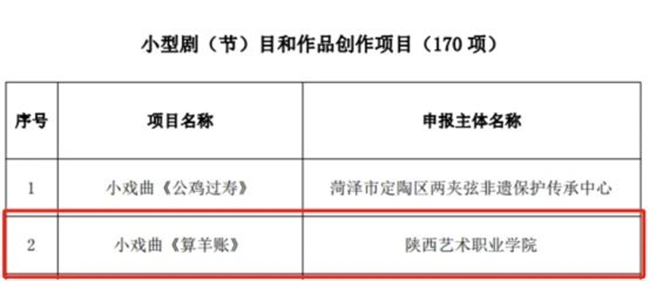 西部決策網(wǎng)訊(記者劉玉 韓宗憲 通訊員 吳卉)近日,國家藝術(shù)基金管理中心公布了《國家藝術(shù)基金(一般項目)2024年度資助項目公示名單》,陜西藝術(shù)職業(yè)學院教師彭馨韻申報的小戲曲《算羊賬》獲批舞臺藝術(shù)創(chuàng)作資助項目(小型?。ü?jié))目和作品創(chuàng)作項目)。