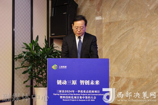 西部決策網(wǎng)訊 近日,“鏈動三原 智創(chuàng)未來”三原縣2024年一季度重點(diǎn)招商項(xiàng)目暨科技轉(zhuǎn)化項(xiàng)目集中簽約大會在咸陽市舉行。省市領(lǐng)導(dǎo)汪文展、李曉靜、吳進(jìn)武、仝保亞、王春霄、程文杰、曾亞龍等出席活動??h委書記趙俊強(qiáng)致辭??h委副書記、縣長楊紅剛主持??h委常委、常務(wù)副縣長蒙小衛(wèi)等介紹簽約項(xiàng)目情況。投資企業(yè)、項(xiàng)目單位負(fù)責(zé)人等100余人出席活動。